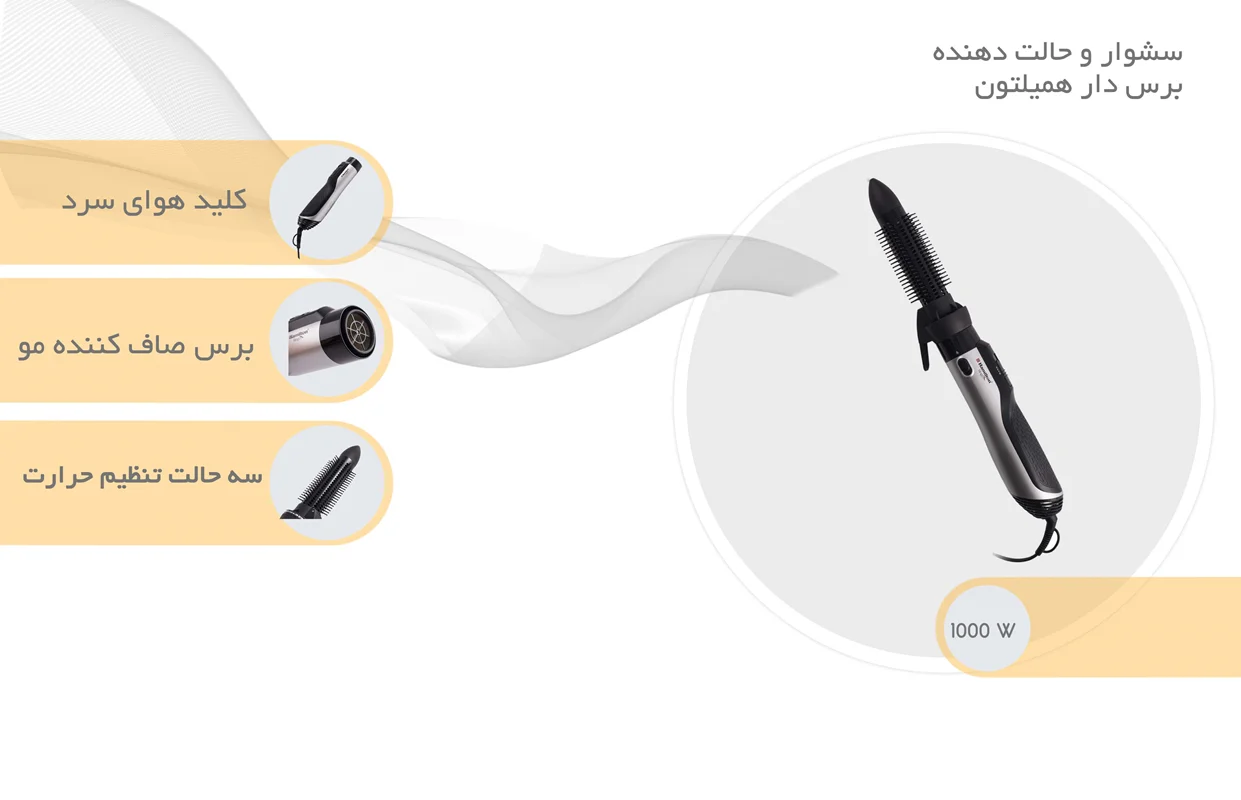 یکی از سشوار های با کیفیت چند منظوره ی موجود در فروشگاه اینترنتی مهرنگ کالا ، سشوار و حالت دهنده برس دار همیلتون 815 می باشد که دارای 7 حالت دهنده جانبی جداگانه ، کلید هوای سرد ، برس صاف کننده و فر کننده مو ، هدایت کننده جهت باد به سمت خاص ، 3 حالت تنظیم حرارت و امکانات دیگر می باشد. طول سیم آن حدود 1.5 متر است و توان مصرفی 1000 وات را دارا می باشد. وزن 1.22 کیلوگرم دارد و برای استفاده خوش دست و کم حجم می باشد. شما عزیزان می توانید این سشوار و حالت دهنده ی فوق العاده و همچنین سایر سشوار ها و لوازم شخصی برقی با کیفیت را در مهرنگ کالا مشاهده نمایید و متناسب با نیاز و علاقه ی خود اقدام به ثبت سفارش نمایید.